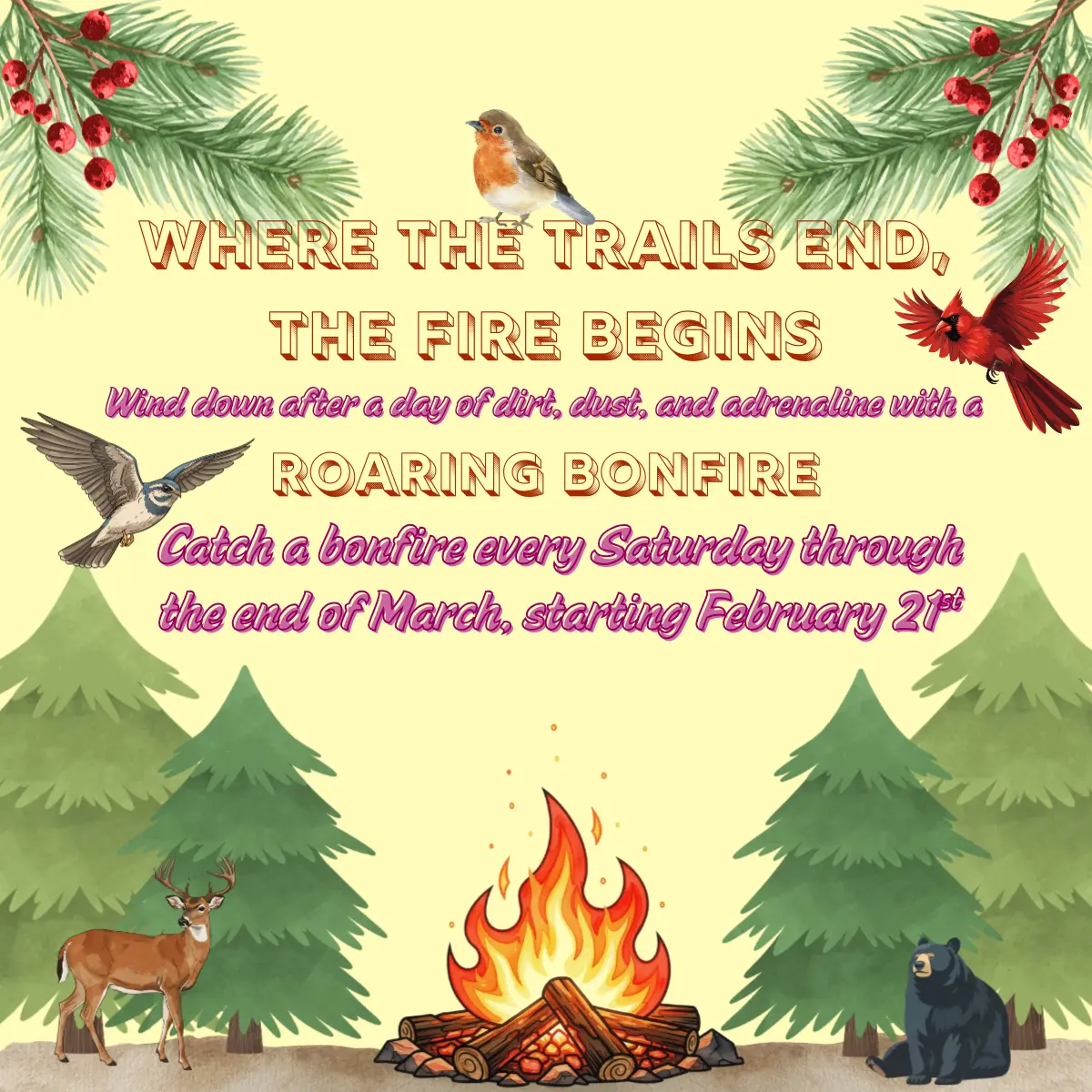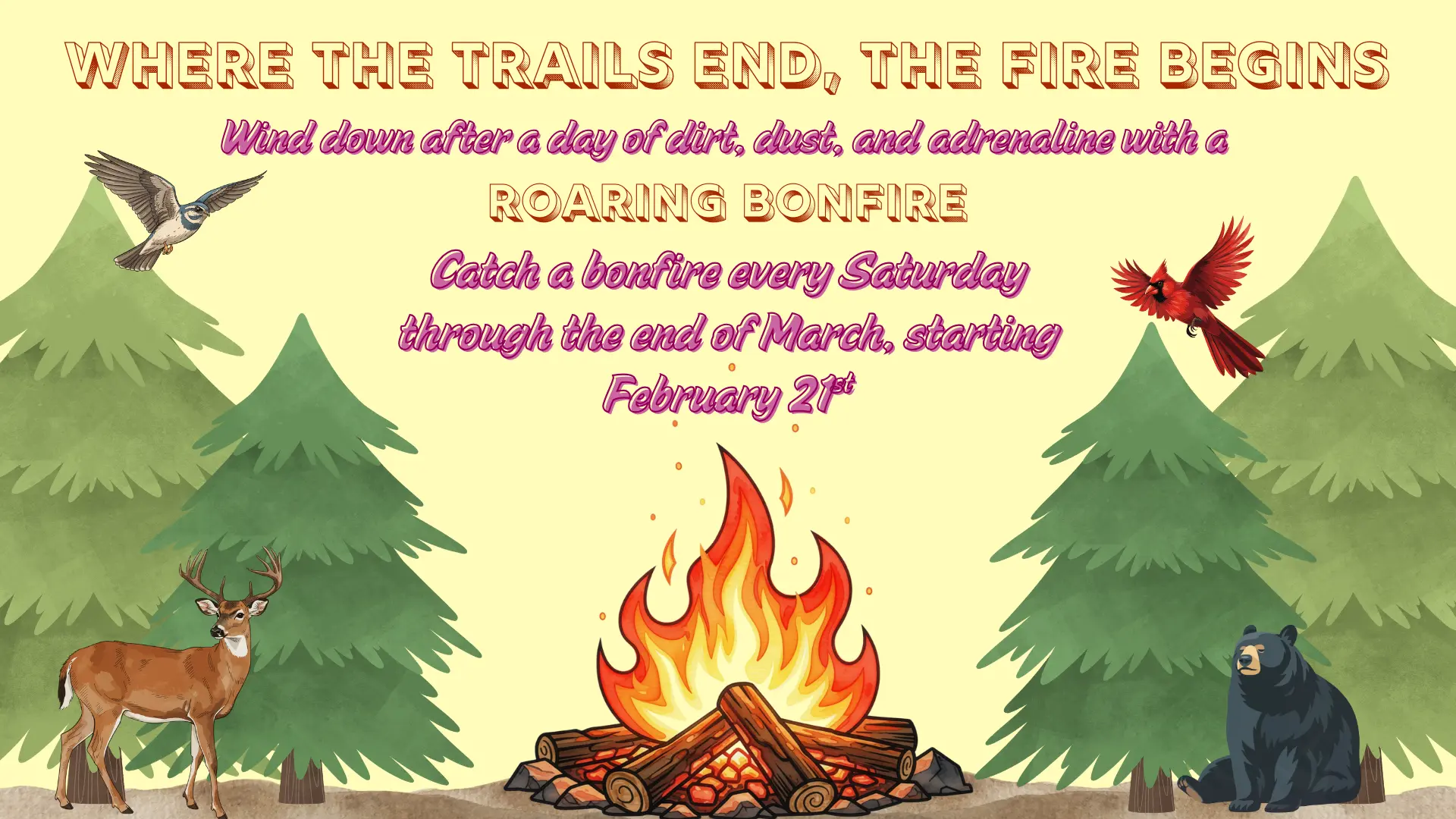 Starting February 21st and running through the end of March, join us every Saturday night for a laid-back post-ride hangout. The bonfire starts once the sun goes down and is included with regular parking passes. Bring your friends, swap trail stories, warm up by the fire, and enjoy the adventure road lifestyle the way it was meant to be.